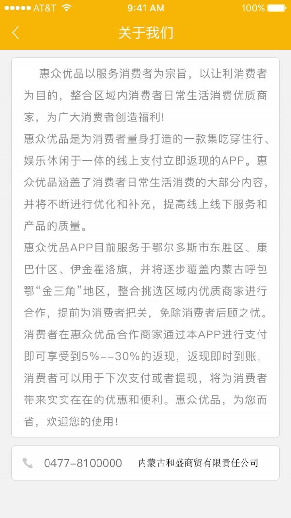 惠众优品APP是本公司为消费者量身打造的一款集吃穿住行娱乐休闲于一体的线上支付立即返现的APP。整合挑选区域内精品优质商家进行合作。APP为消费者打通线上支付线下消费,消费者在合作商家通过APP支付即可享受到5%-30%返现,返现即时到账,消费者可以用于下次支付或者提现,为消费者带来更多的实惠和便利。