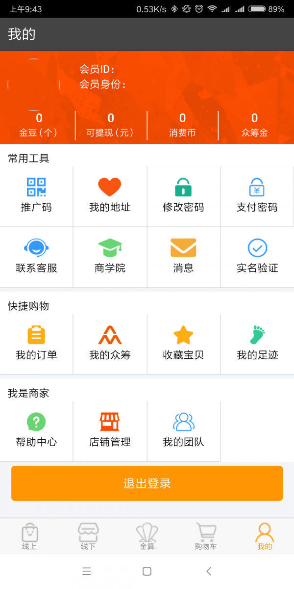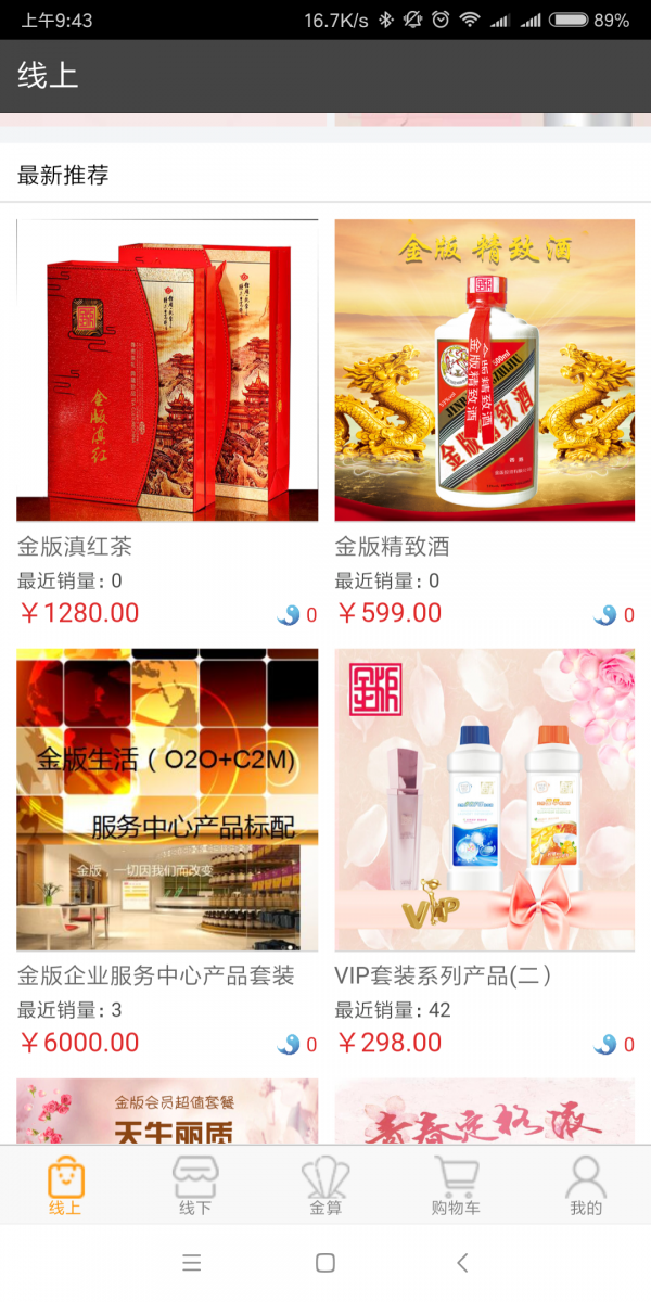 当前版本分为五个模块 线上、线下、金算、购物车、我的。
