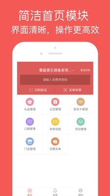 验券:支持验证认我行券码以及二维码券码扫描验证,多种方式验证更易使用,一键验证更便捷!