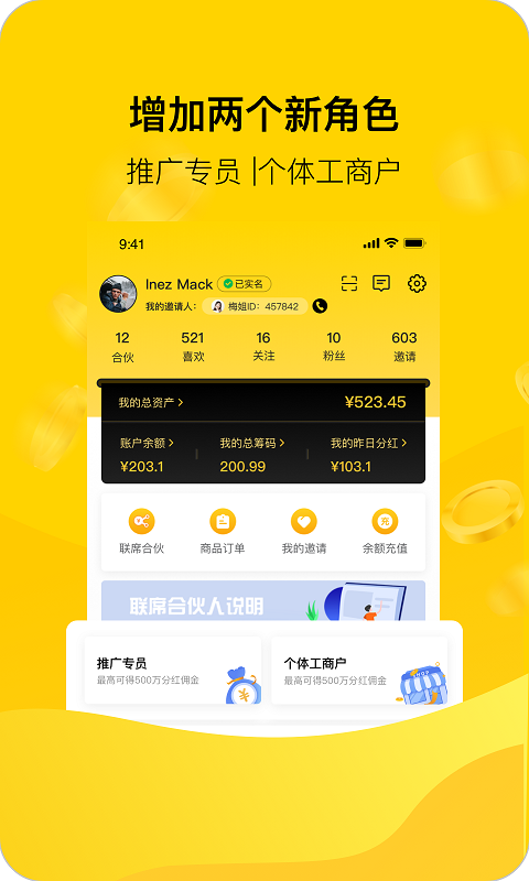 用户在平台内可通过购物、微博微信社交行为、用户生活数据(如每日走路数等)分别获取“筹码”,“筹码”可再次对全平台商品进行配置,每日获得分红。该分红会根据商品权重指数和商品销售额自动分配,公平公开。“筹码”属于用户资产,只会累加,在获得分红后,“筹码”也不会消失或减少。