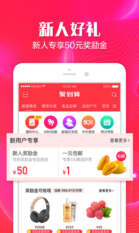 聚划算软件在发挥手机特色的同时结合平台力量走入您的生活。手机购物,不再是一种消费形式,已然成为时下生活方式。