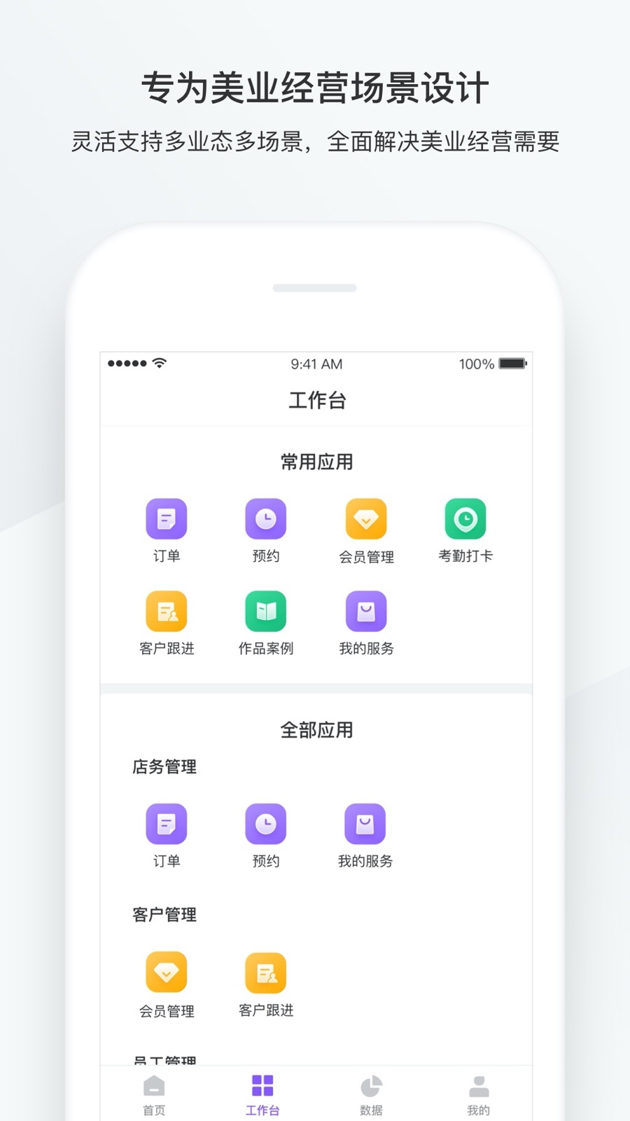 对于商家,在线预约,开单收银,售卡,会员管理,经营分析,提升门店效率,互联网品牌传播,减少经营成本。对于顾客,在线预约,购卡,灵活调整消费时间,让美随时随地的发生。