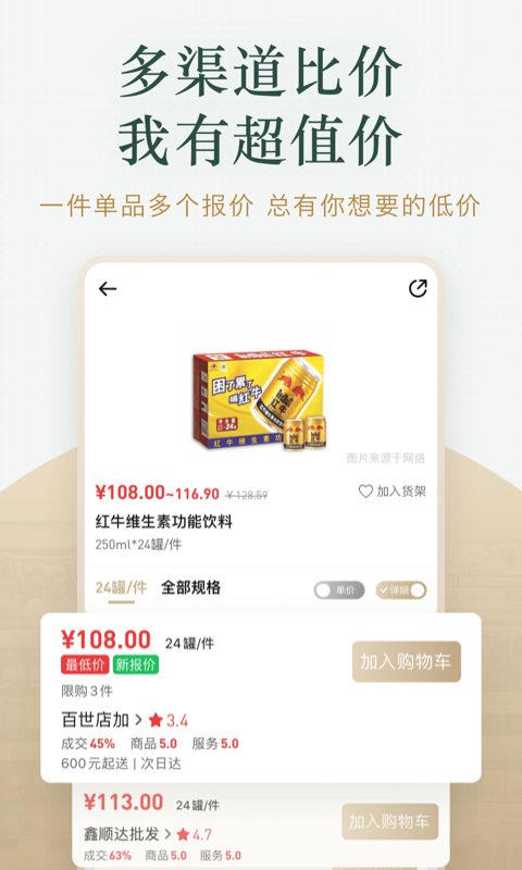货圈全是国内首家杂货铺进货比价工具——万家供应商供你比出最低价商品!货圈全将包括阿里零售通、京东掌柜宝、果亲王、链商优供等一万余家供应商的价格信息全部列出。一种商品多种报价,让老板先比价后进货!