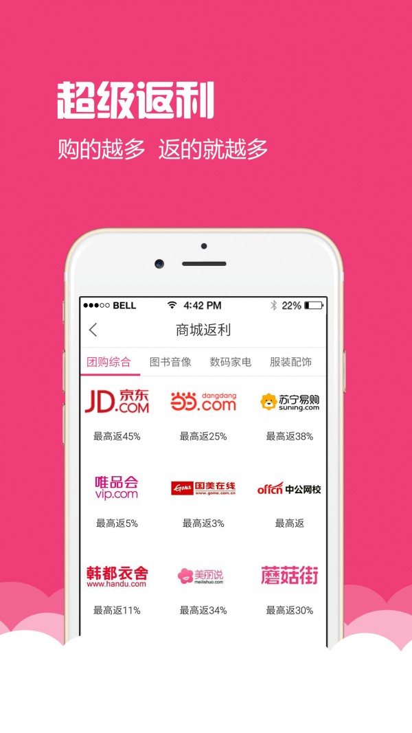 5、【商城返利】:支持多家电商,京东、聚划算、唯品会、聚美优品等都可享受商城返利,优惠多多,折扣多多!