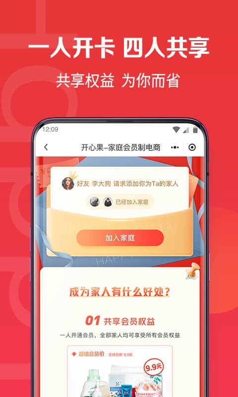 邀请家人一起共享会员权益、家庭账户余额,购买高性价比商品,享受高质量售后服务。一人办卡,全家共享。
