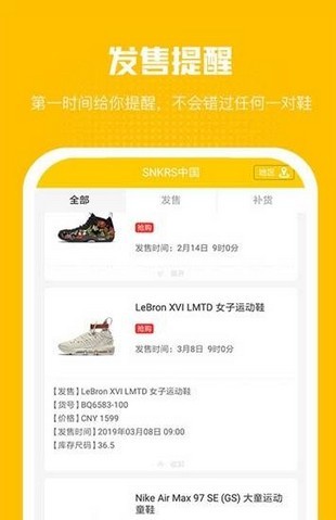发售提醒 不同渠道的发售信息,及时给你提醒,让你不会错过任何一对球鞋。