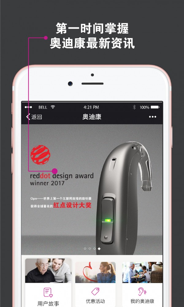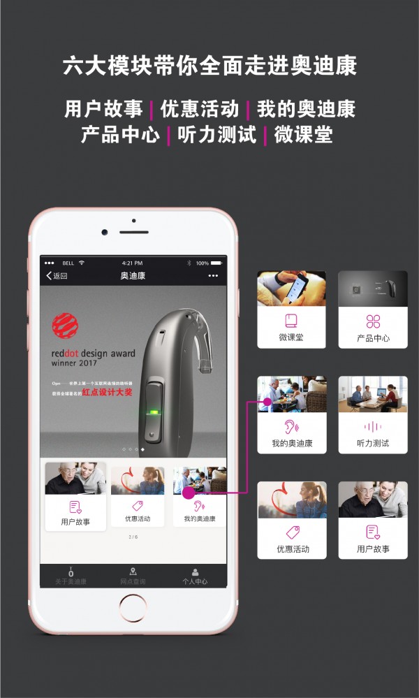 我的奥迪康app是一款为听力损失人士打造的电商平台,在这里,您不仅可以测试听力状况,学习助听器知识,了解前沿科技,更能能及时查询助听器讯息。