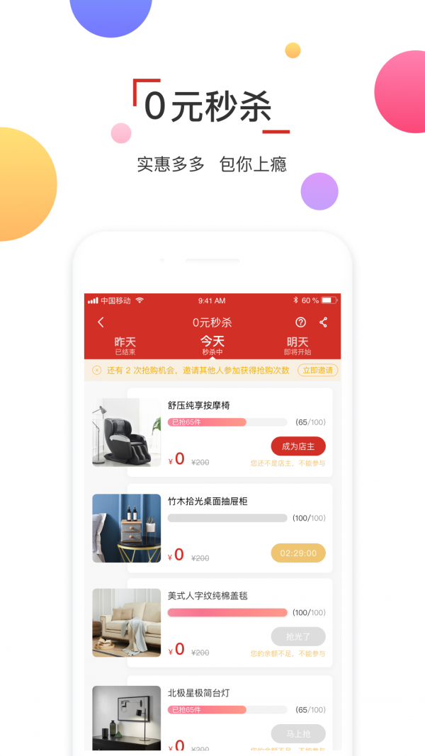 2.每天都可以享受优惠活动,0元也能抢到好物,每天优惠多多哦;
