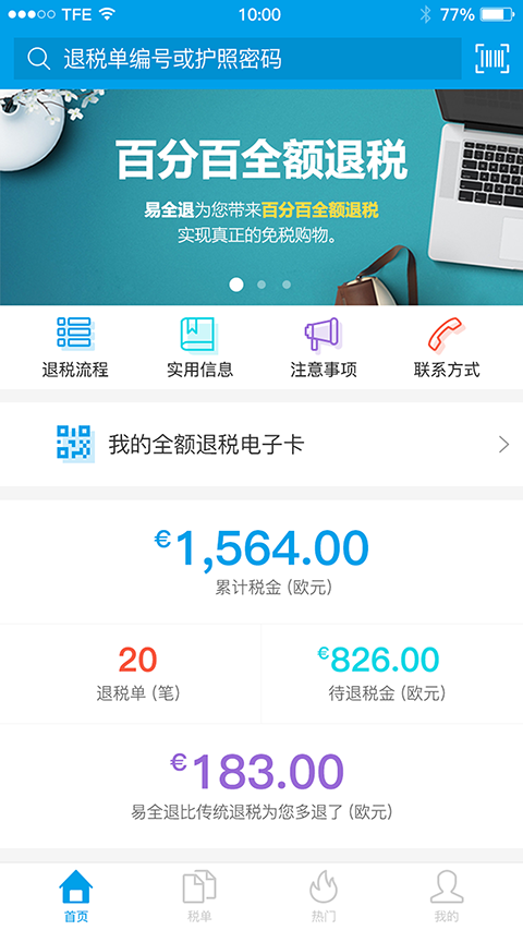 易全退app是一款网络购物应用,易全退app为广大旅欧游客提供便捷的退税服务,无需填单,实时推送税单信息,随时了解最新进度,让退税更便捷。
