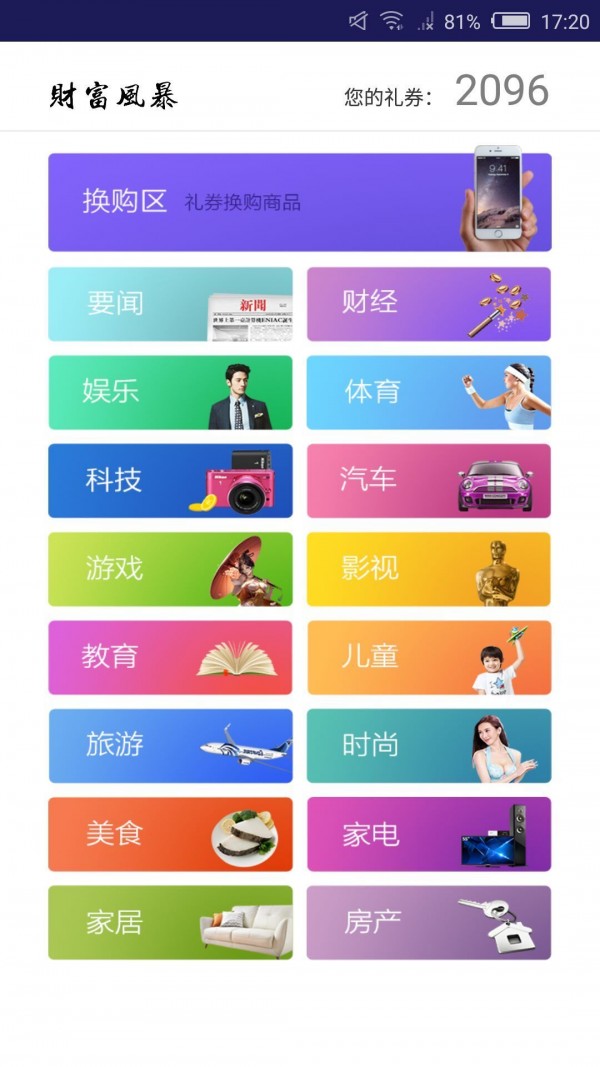 财富风暴网罗资讯,用户在频道区每浏览/观看1分钟,即可获赠1礼券,即1分钟=1礼券(礼券有效期为30天)。用户使用礼券,可在换购区兑换16类产品,特别是衣、食、住、行四类生活刚需产品,从而完成“时间就是金钱”的用户体验。
