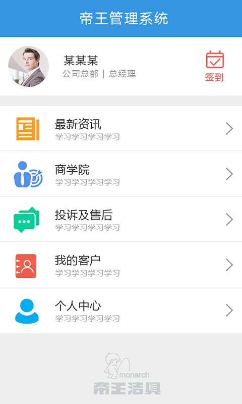 “我的帝王”是由四川帝王洁具股份有限公司打造的一款移动办公管理系统,主要功能包括:新闻资讯、课程学习及考试、客户管理、投诉及售后管理、问卷调查、积分商城等。