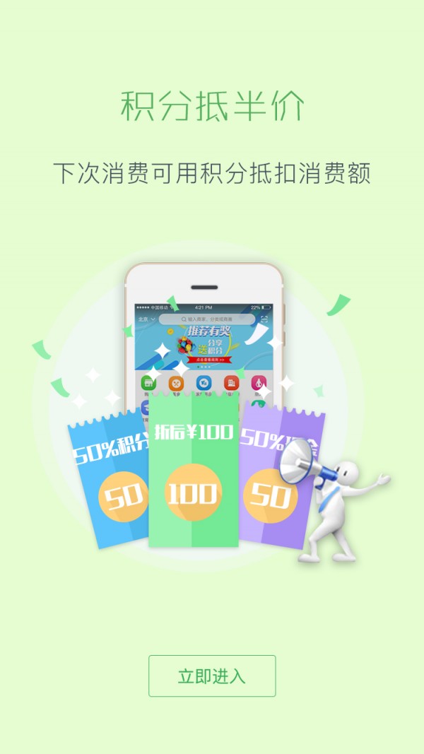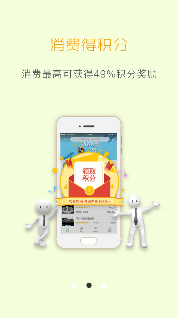 积分赠送:1积分等于1元钱,在平台内任意商家消费使用;