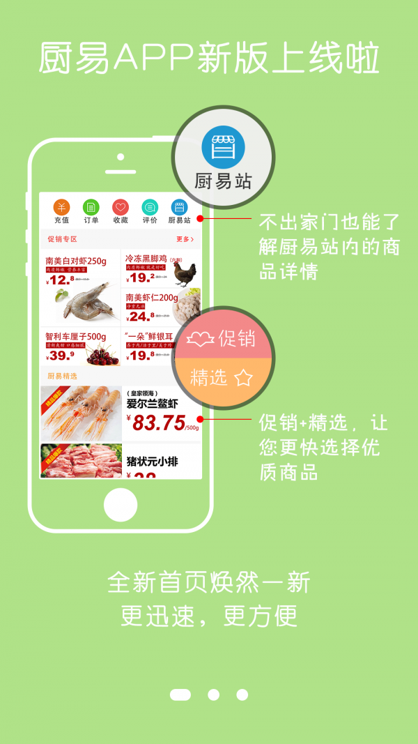 厨易时代app是上海厨易配菜有限公司推出的移动终端,成立于2010年5月的上海厨易配菜有限公司,集采供平台、城市生鲜物流、社区销售终端于一体的全新都市生鲜食品o2o模式,科学汲取农贸市场和现代卖场及电子商务的优势,改善传统生鲜食品流通和销售的不足之处。