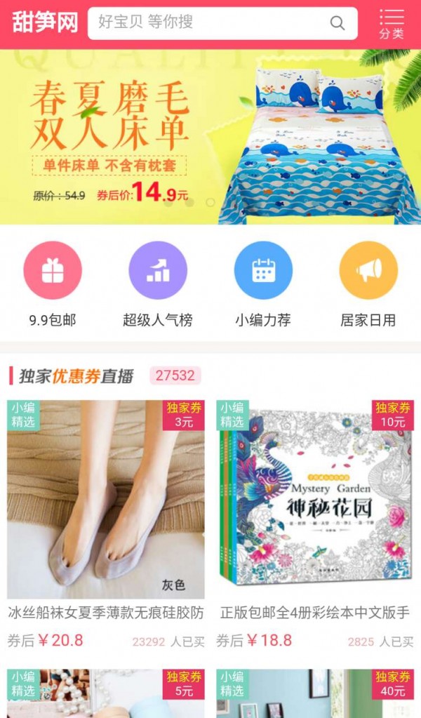 甜笋网appp是一款网络购物应用,甜笋网app为用户提供大量折扣商品信息,方便用户通过软件快速领取优惠券,享受更实惠省钱的网络购物体验。