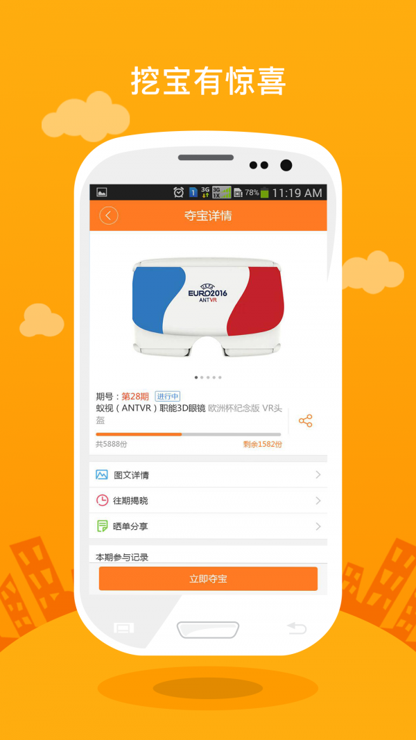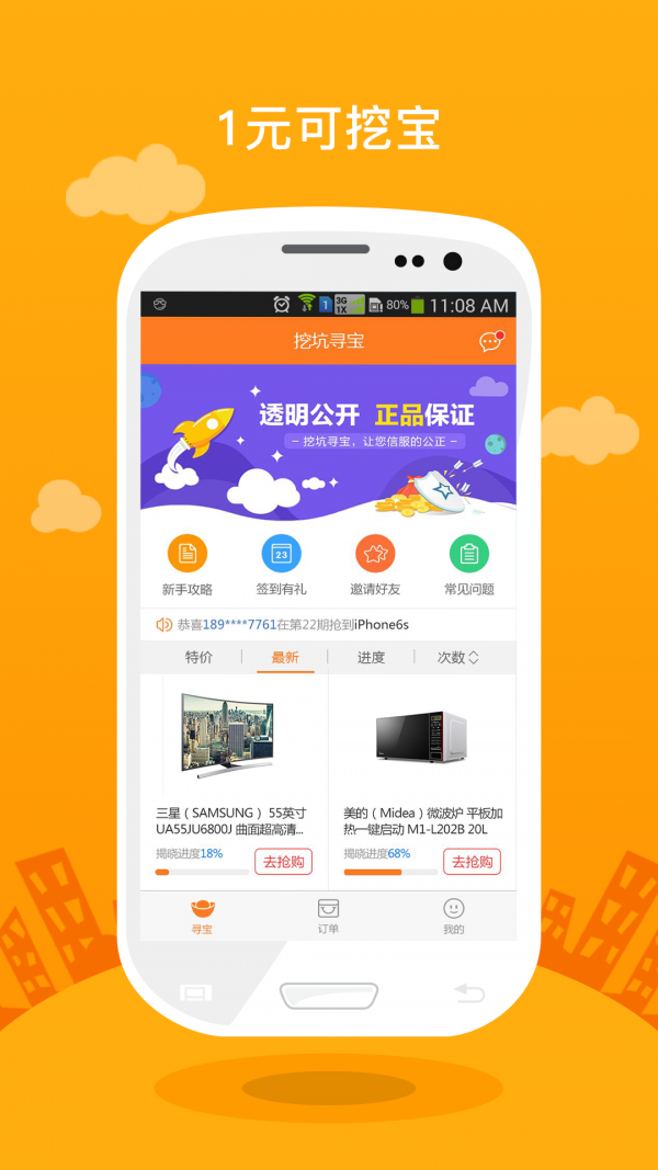 挖坑寻宝app是华夏融创集团旗下的一款手机购物软件,采用全新众筹购物模式,用户通过挖坑寻宝app,只需1元就能参与夺宝活动,获取物超所值的商品。