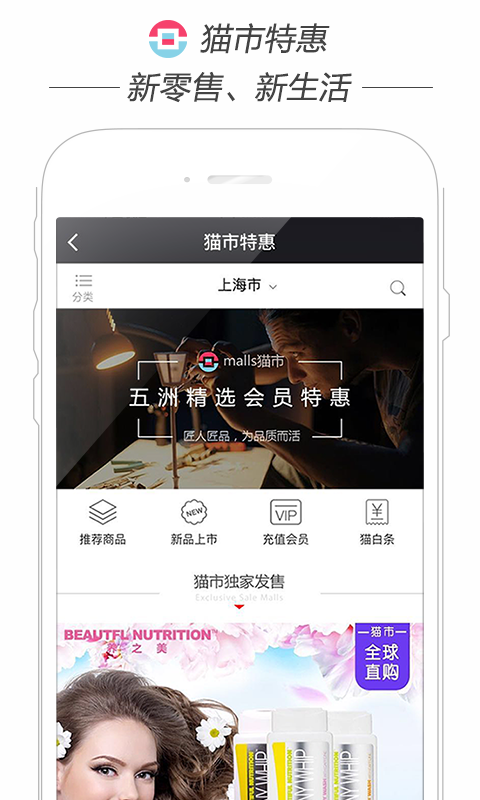 猫市特惠,一个面向中产阶级消费群体的分销系统,并推出“猫市五洲精选会员特惠店”线下体验店。消费者将不只是消费者,消费者也可以是店铺的合伙人,购物可以不花钱,买东西还可以分红。既能买到全球优质的进口商品,又能在不经意间持续不断地分红,这才是新零售的魅力!