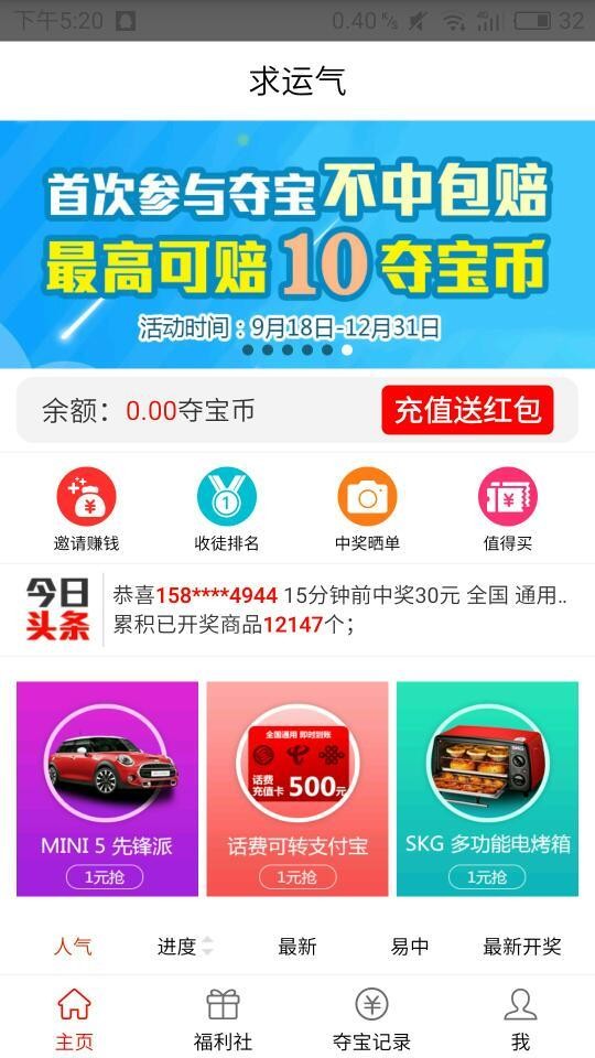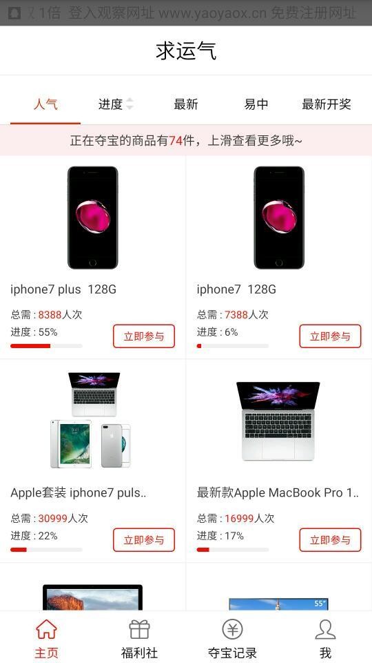 【求运气】一款大型的趣味活动APP;专注于移动端的众筹购物方式,用户可以通过玩游戏或支付1元获得带走千元大奖的机会。多种多样的热门商品,惊喜随时等你来。全程保证公平公开公正;还可以分享给好友,邀请好友一起来玩游戏;