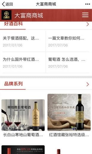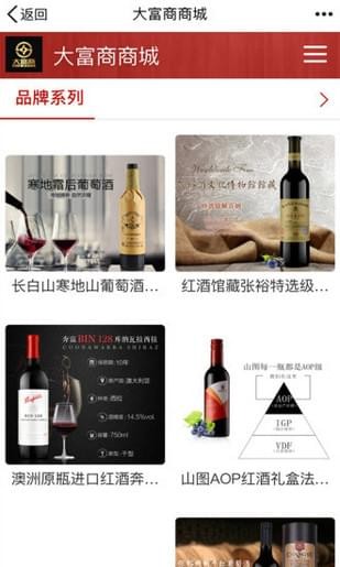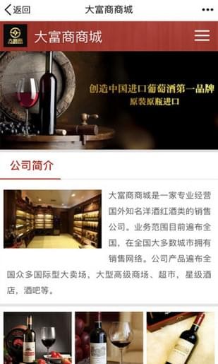 大富商商城app是一家专业经营国外知名洋酒红酒类的销售公司。业务范围目前遍布全国,在全国大多数城市拥有销售网络。公司产品遍布全国众多国际型大卖场,大型高级商场、超市,星级酒店,夜总会,中西餐厅,酒吧等。红酒批发,红酒团购,红酒招商,葡萄酒批发,进口红酒。是红酒种类最多的销售商城之一!
