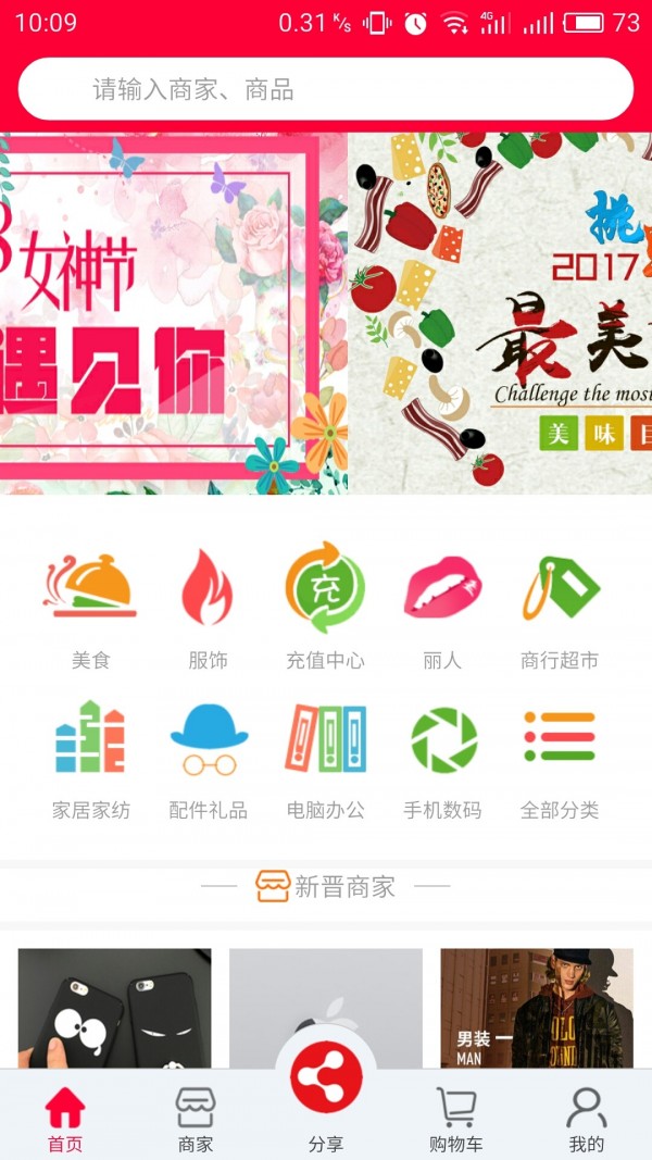 6.首页展示类目、精选商品、新晋商家、积分抢购展示。