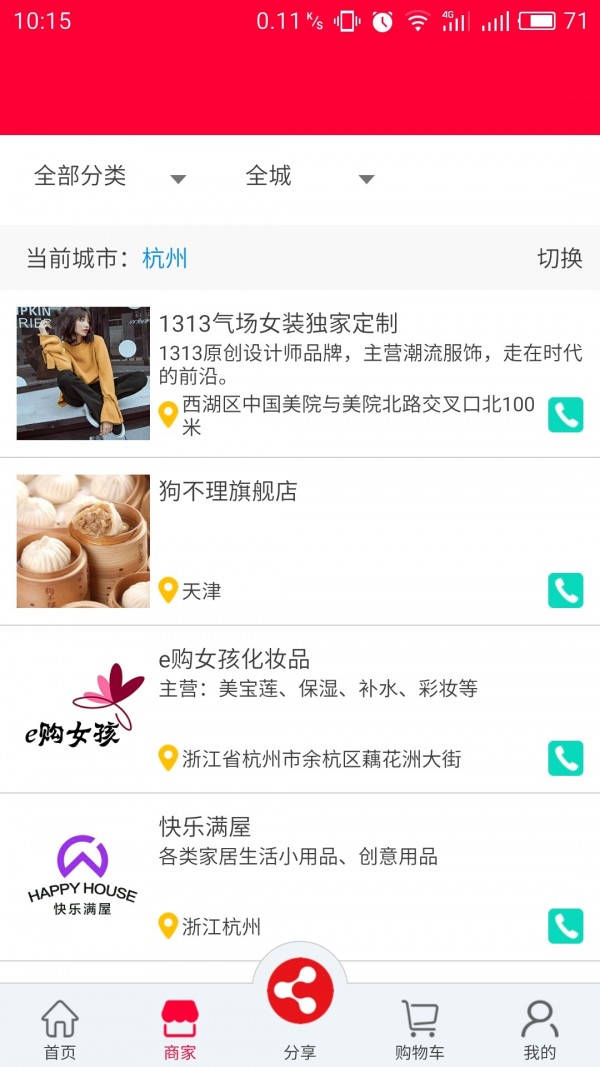 7.商城界面展示商铺,可查询不用区域的店铺。