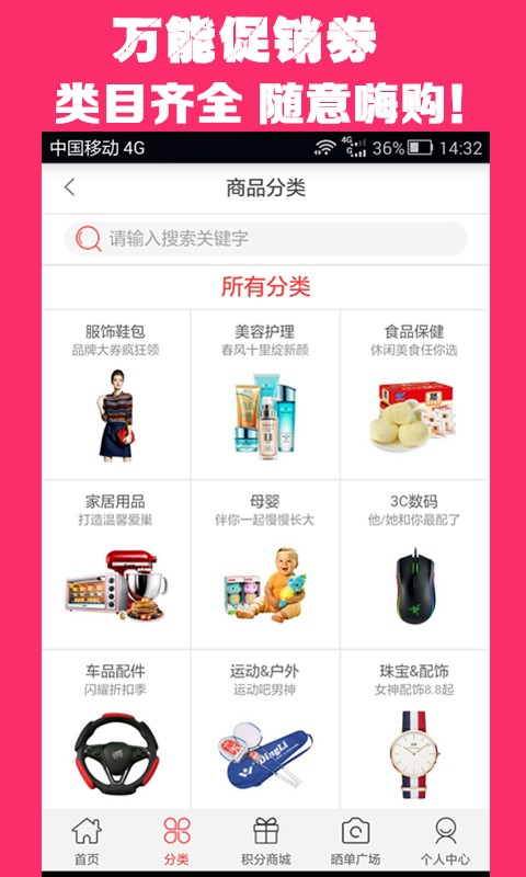 5、精品分类-服装、美食、美妆、母婴、家居日用等明确分类,轻松购物。