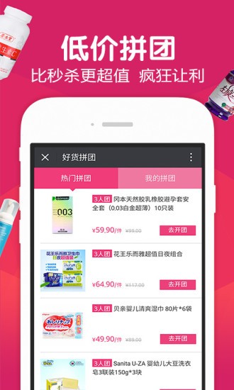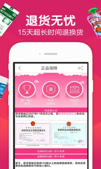 4、产品买贵就赔:新用户立赠450元!特有“母婴贵就赔”,“健康贵就赔”等专区,限量秒杀大牌药品等你来抢!