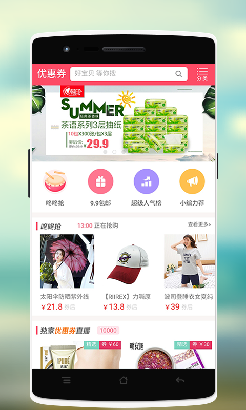 为什么别人买的宝贝便宜又好?因为他们在用嗨淘券,每天提供一万多个带内部优惠券的商品,商家为了冲量,也是蛮拼的,放出来的优惠券力度也是很惊人的,用优惠券的能节省10%-60%的网购优惠券,我们只提供优惠券,用户只需要在我们这里领券,购买环节完全在官方平台操作,安全放心。APP与官方平台产品库对接,涵盖了服装,鞋包,美妆,美食,家具,母婴,家电,数码等主要类目,猫宝优惠券拥有商品查找,领卷,9.9包邮等功能,手指点一点即可省下一笔钱,一年网购花一万,通常猫宝优惠券,省下1000-6000不是梦,让钱更值钱。