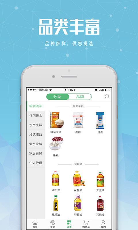 品类丰富 食品饮料.厨房食品.海鲜水产,蔬菜水果.菜篮子.土特产.日用品七大类万余种商品,满足人们生活所需。