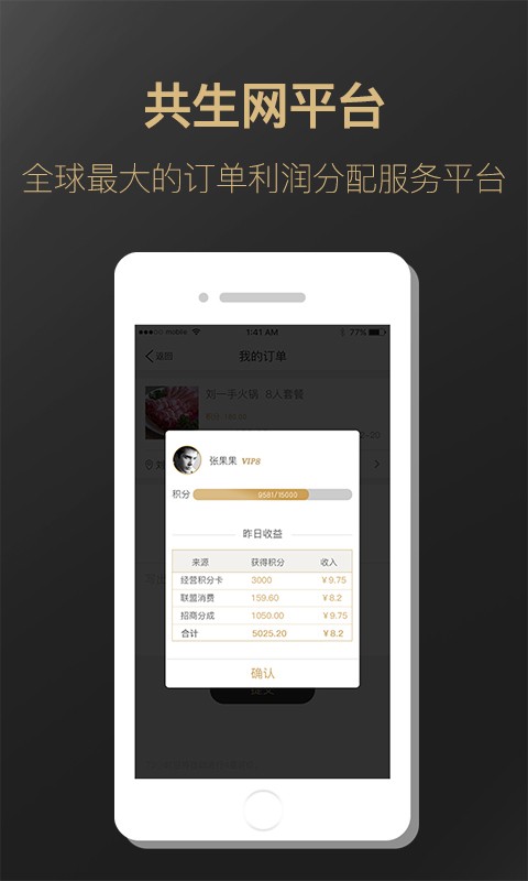 共生网app结合了团购与返利网的功能,共生网用户可通过线上下单或线下付款,享受会员折扣与自身消费返利,省上加省,一省到底;粉丝消费同样享受返利。