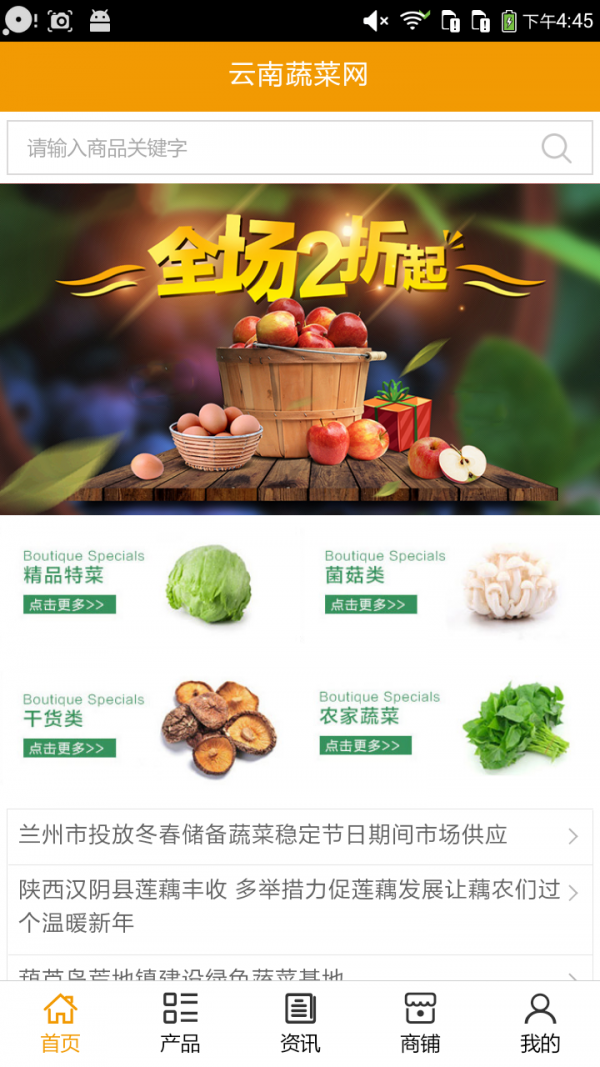 云南蔬菜网客户端不仅具备购物、查询订单、搜索商品、行业资讯和产品评价等常用功能,而且还实现了手机版特有的会员注册登录、广告位、招商开店等功能。