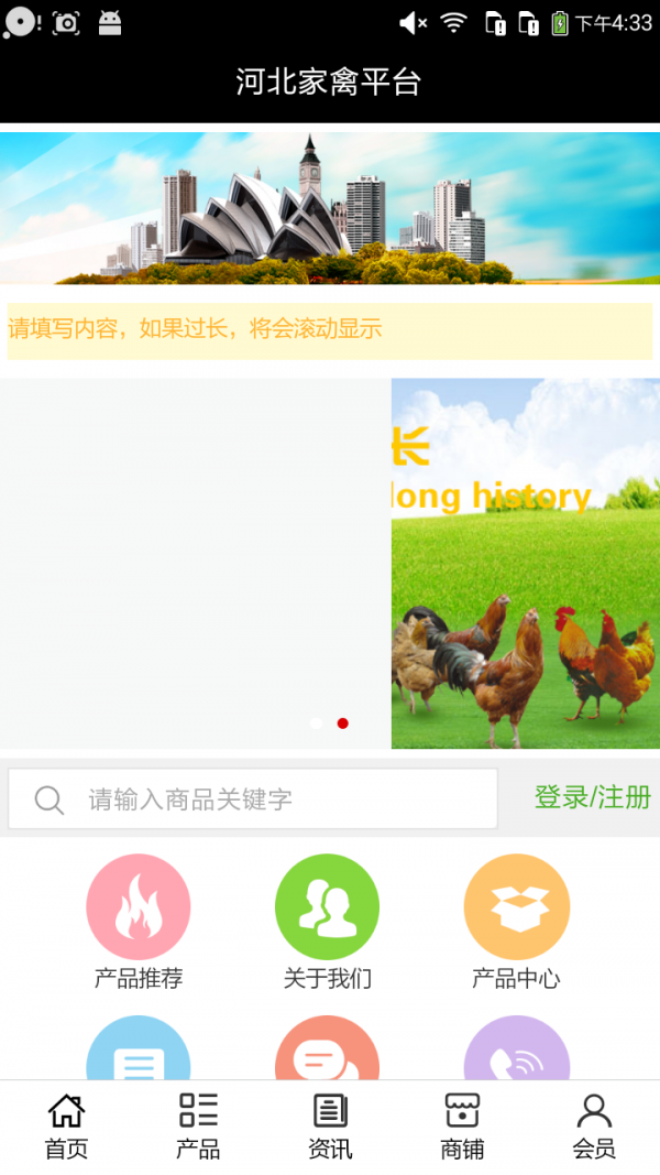 河北家禽平台客户端不仅具备购物、查询订单、搜索商品、行业资讯和产品评价等常用功能,而且还实现了手机版特有的会员注册登录、广告位、招商开店等功能。