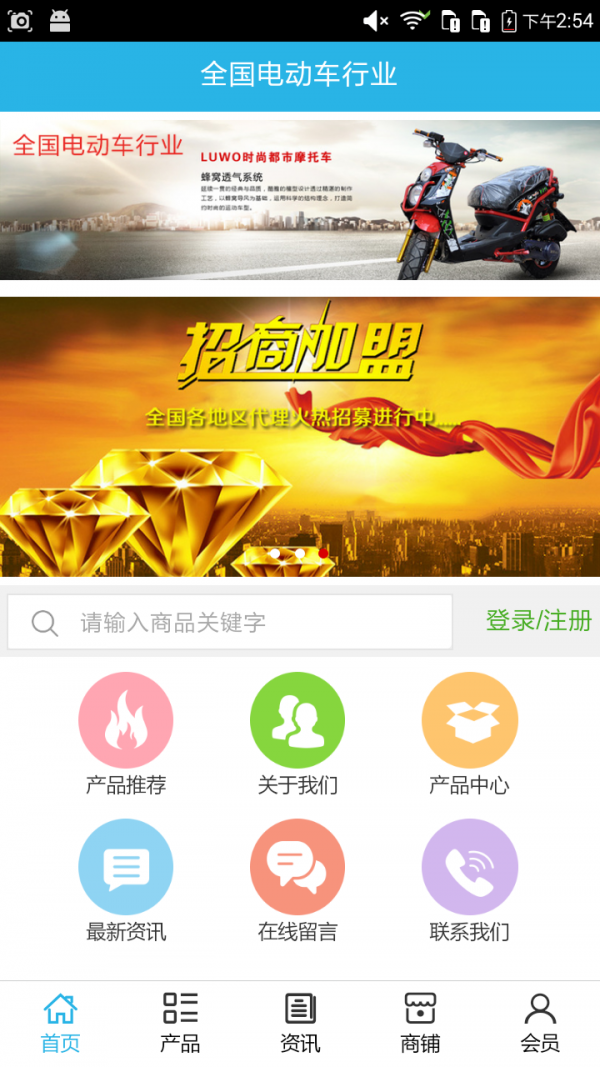 全国电动车行业App不仅具备购物、查询订单、搜索商品、行业资讯和产品评价等常用功能,而且还实现了手机版特有的会员注册登录、广告位、招商开店等功能。目标是整合当地品牌商、生产商、经销商,为商家和消费者之间提供一站式解决案。
