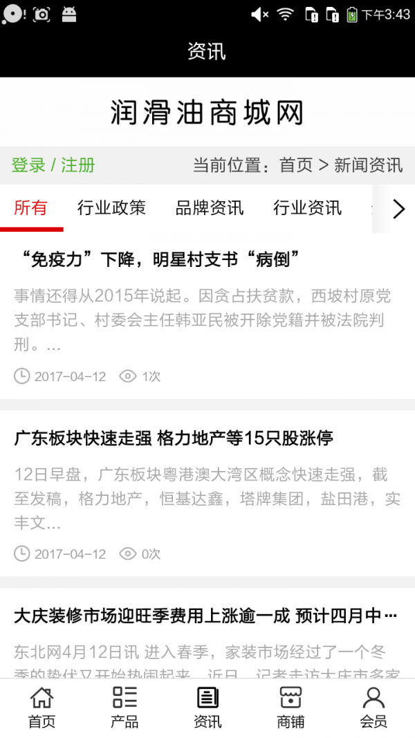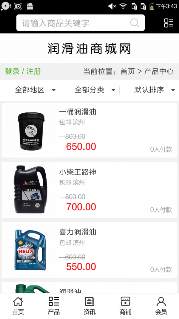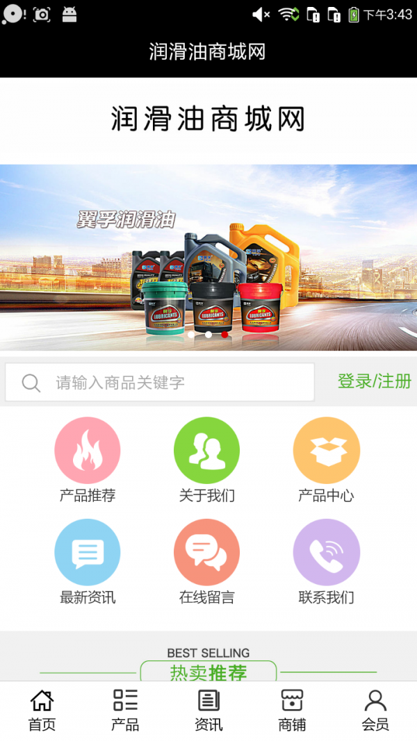 润滑油商城网客户端不仅具备购物、查询订单、搜索商品、行业资讯和产品评价等常用功能,而且还实现了手机版特有的会员注册登录、广告位、招商开店等功能。