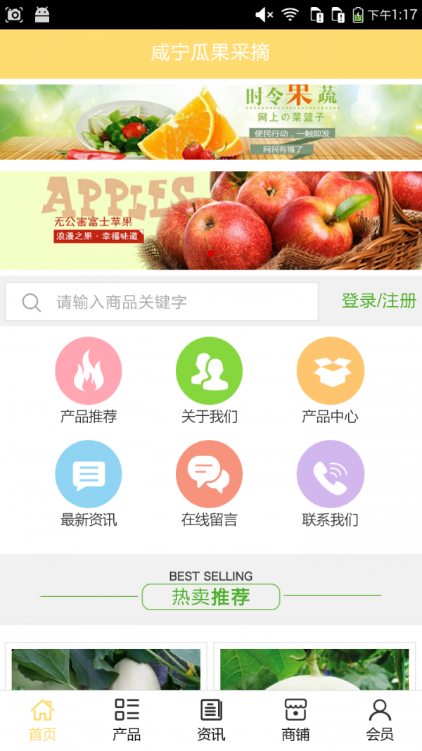 咸宁瓜果采摘app不仅具备购物、查询订单、搜索商品、行业资讯和产品评价等常用功能,而且还实现了手机版特有的会员注册登录、广告位、招商开店等功能。目标是整合当地品牌商、生产商、经销商,为商家和消费者之间提供一站式解决案。