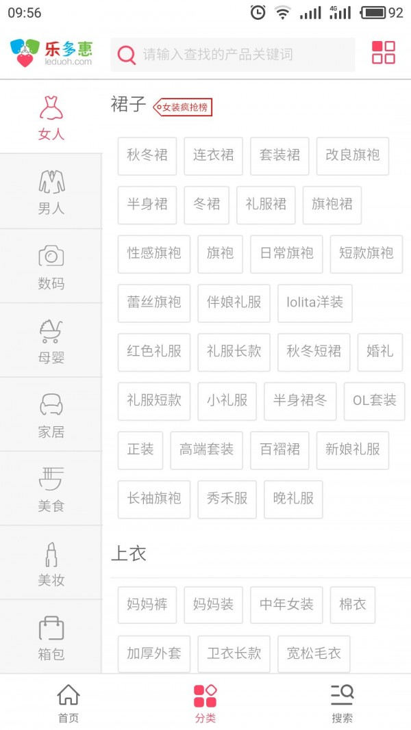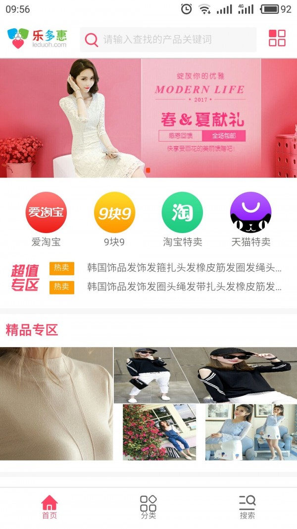 乐多惠App涵盖业务类型有9块9、天猫特卖、淘宝特卖等,主营类目涵盖男女服装、化妆品、母婴、零食等。