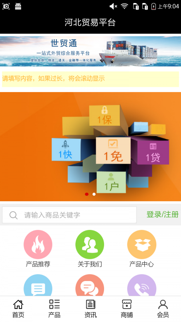河北贸易平台客户端不仅具备购物、查询订单、搜索商品、行业资讯和产品评价等常用功能,而且还实现了手机版特有的会员注册登录、广告位、招商开店等功能。