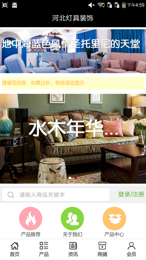 河北灯具装饰客户端不仅具备购物、查询订单、搜索商品、行业资讯和产品评价等常用功能,而且还实现了手机版特有的会员注册登录、广告位、招商开店等功能。