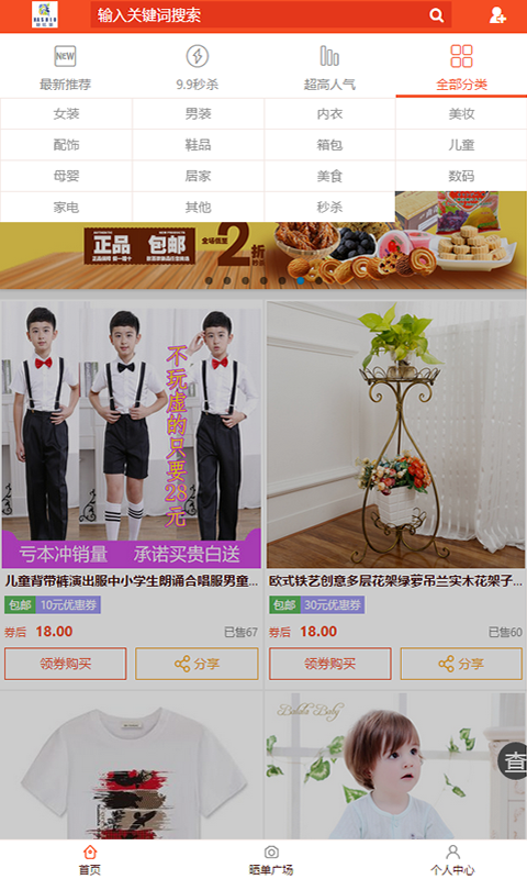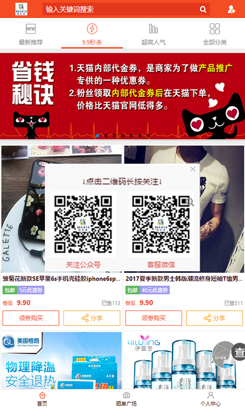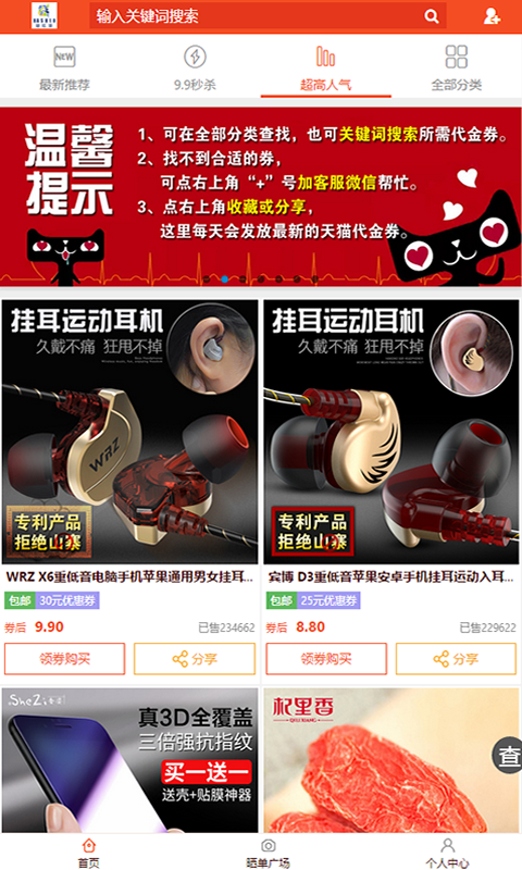 每日实时更新上万款商品其中含有:最新推荐、9.9秒杀、超高人气榜、全部分类。