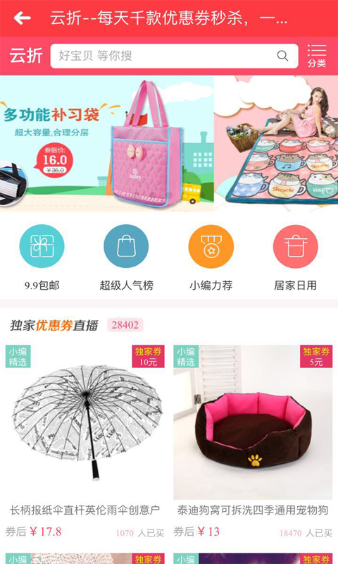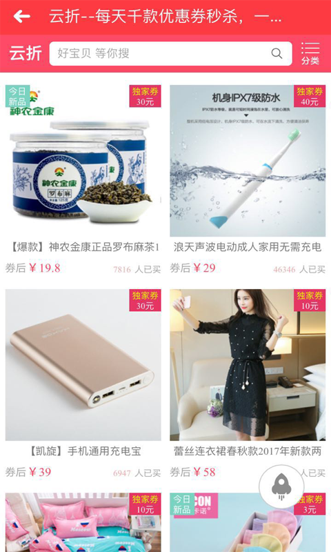 云折--每天更新数百款新折扣信息商品,价格超低,优惠不断 为用户提供各类目商品低价内部折扣价格,包括服装、美食、手机、电脑、车品、户外用品等商品。