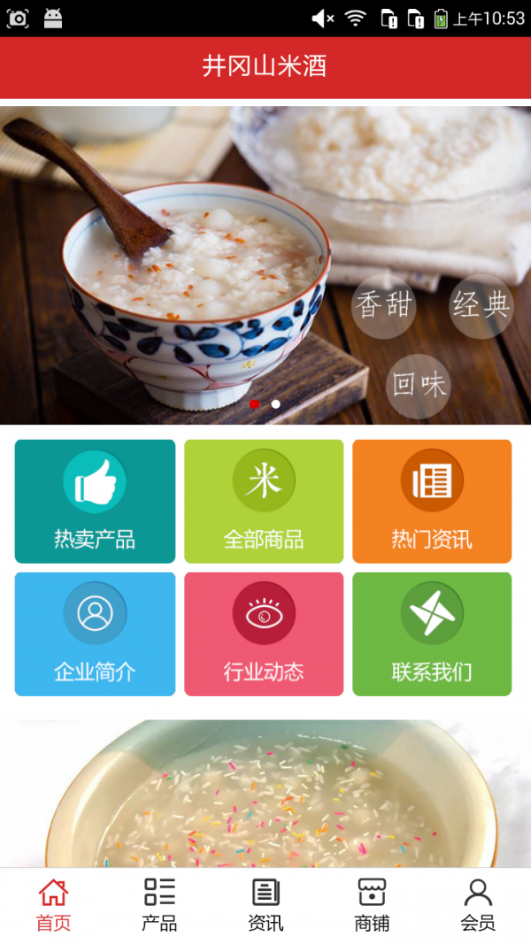井冈山米酒客户端不仅具备购物、查询订单、搜索商品、行业资讯和产品评价等常用功能,而且还实现了手机版特有的会员注册登录、广告位、招商开店等功能。