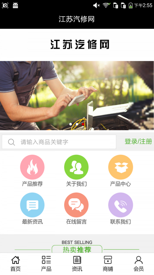江苏汽修网App不仅具备购物、查询订单、搜索商品、行业资讯和产品评价等常用功能,而且还实现了手机版特有的会员注册登录、广告位、招商开店等功能。目标是整合当地品牌商、生产商、经销商,为商家和消费者之间提供一站式解决案。
