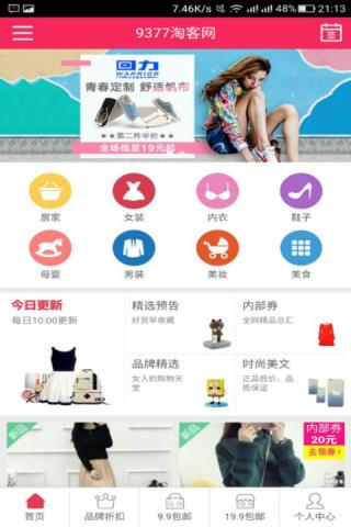 9377淘客网,是手机必备的优惠购物神器,服饰,母婴,居家,美妆,鞋包,美食,数码电器等商品天天都有特价,物美低价包邮。