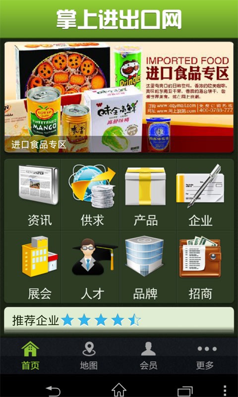 另外设有:产品、政策动态、品牌展示、供需商机、行业展会、人才招聘及热门企业的推荐。通过掌上进出口网平台,全方位了解市场最新动态。