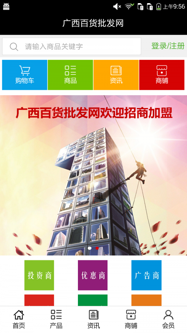 广西百货批发网app不仅具备购物、查询订单、搜索商品、行业资讯和产品评价等常用功能,而且还实现了手机版特有的会员注册登录、广告位、招商开店等功能。目标是整合当地品牌商、生产商、经销商,为商家和消费者之间提供一站式解决案。