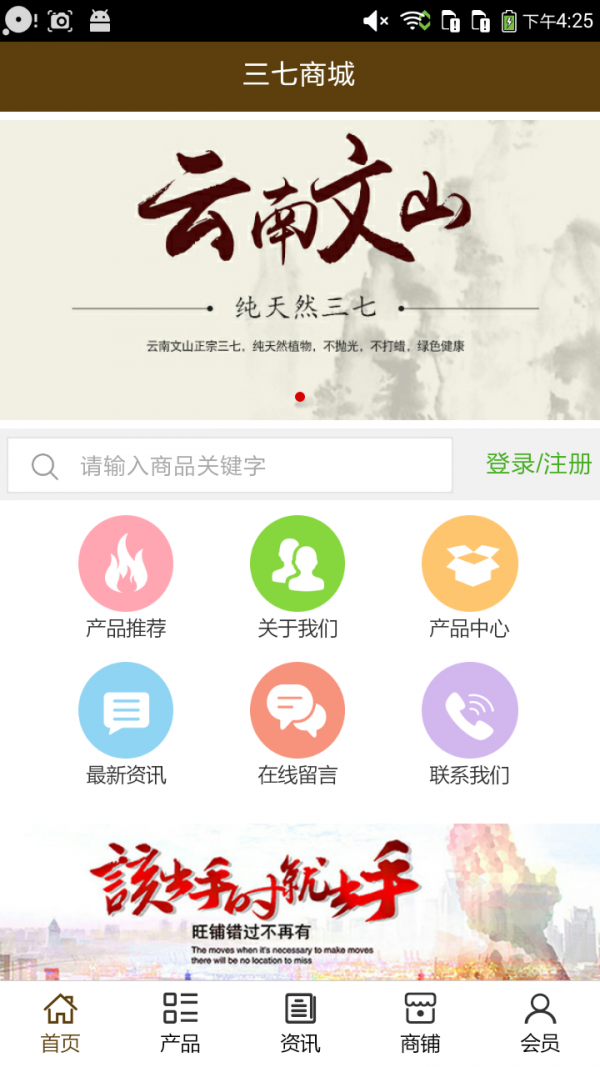 三七商城客户端不仅具备购物、查询订单、搜索商品、行业资讯和产品评价等常用功能,而且还实现了手机版特有的会员注册登录、广告位、招商开店等功能。