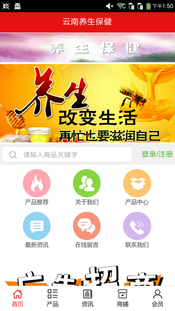 云南养生保健app不仅具备购物、查询订单、搜索商品、行业资讯和产品评价等常用功能,而且还实现了手机版特有的会员注册登录、广告位、招商开店等功能。目标是整合当地品牌商、生产商、经销商,为商家和消费者之间提供一站式解决案。