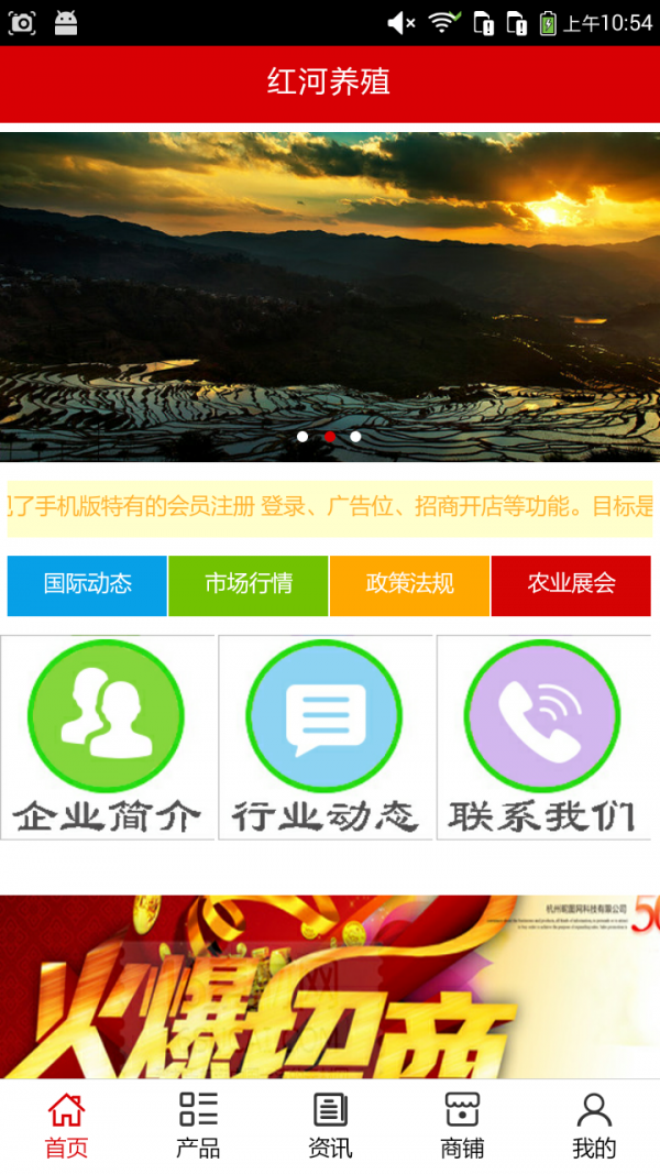 红河养殖客户端不仅具备购物、查询订单、搜索商品、行业资讯和产品评价等常用功能,而且还实现了手机版特有的会员注册登录、广告位、招商开店等功能。
