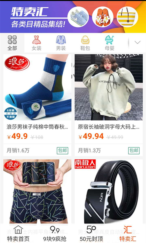 9块9淘app是一款网络购物应用,9块9淘app为用户精选大量优质特价商品,让用户可以享受超实惠省钱的九块九包邮网购服务,购物更实惠省钱。