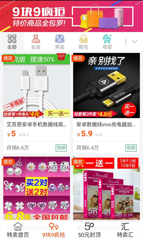 九块九淘,领先专注9.9包邮。在移动互联网首创9块9包邮购物模式,受到广大用户喜爱。九块九淘是中国优惠购物助手,主打低价超值。9.9元包邮任性到底,不仅价低,更要保证品质,6大程序验货,质量有保证。以满足每一位用户的期待为目标,九块九包邮每天提供的品类包括:女装,男装,女鞋,男鞋,母婴等核心类目商品,所有商品清仓价!