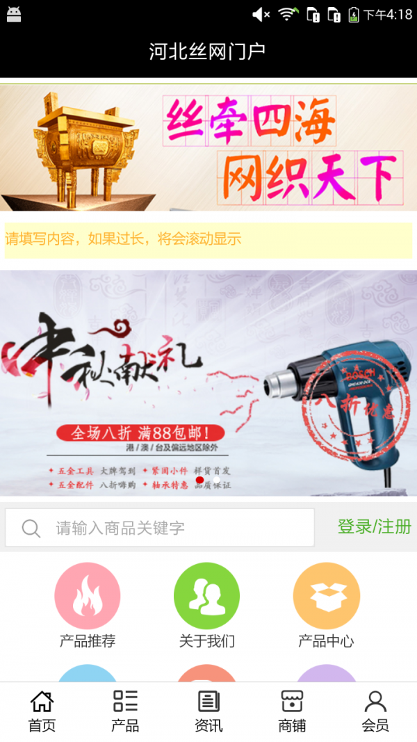 河北丝网门户app不仅具备购物、查询订单、搜索商品、行业资讯和产品评价等常用功能,而且还实现了手机版特有的会员注册登录、广告位、招商开店等功能。目标是整合当地品牌商、生产商、经销商,为商家和消费者之间提供一站式解决案。
